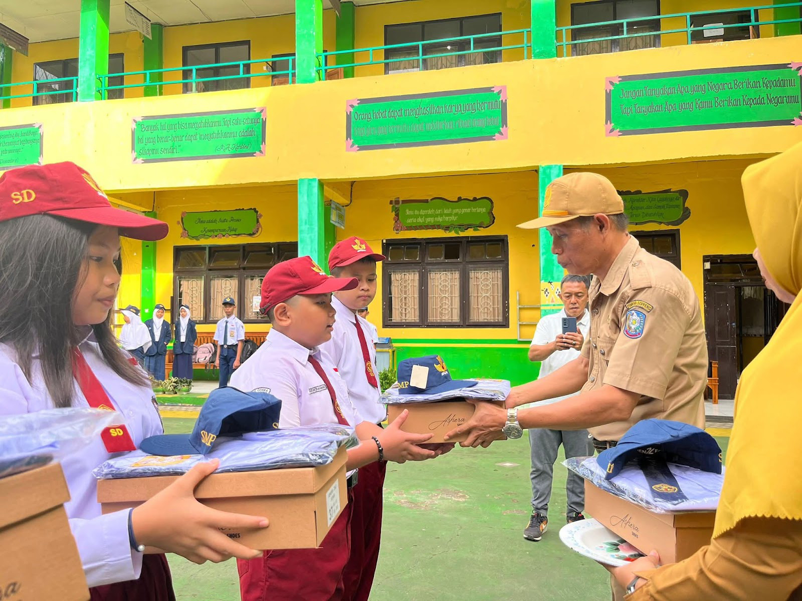 Adapun paket seragam yang dibagikan meliputi baju, celana atau rok, dasi, topi, label nama, dan sepatu. Untuk siswa SD, seragam telah diserahkan ke masing-masing sekolah dan mulai besok akan langsung diterima siswa.