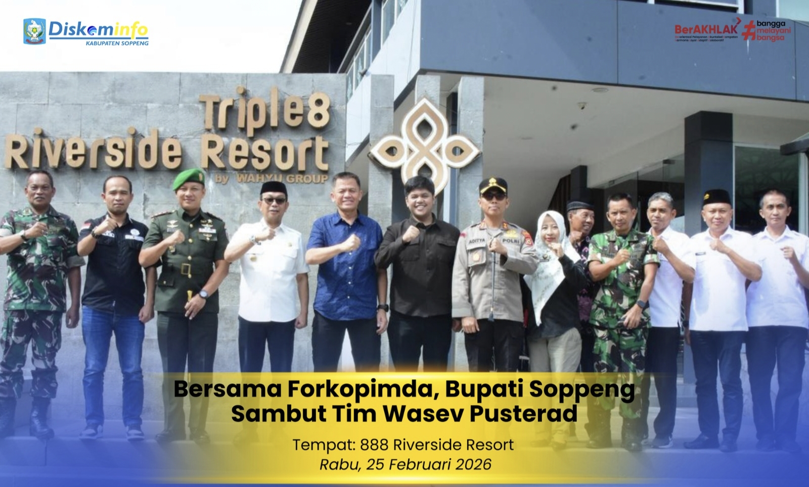 Soppeng – Warta72.com Bupati Soppeng, Suwardi Haseng, menyambut kedatangan Tim Pengawasan dan Evaluasi (Wasev) Pusat Teritorial Angkatan Darat Tentara Nasional Indonesia Angkatan Darat yang dipimpin Mukhlis di 888 Riverside Resort, Rabu (25/2/2026). Kunjungan tersebut turut disambut unsur Forkopimda Kabupaten Soppeng serta sejumlah kepala dinas terkait.