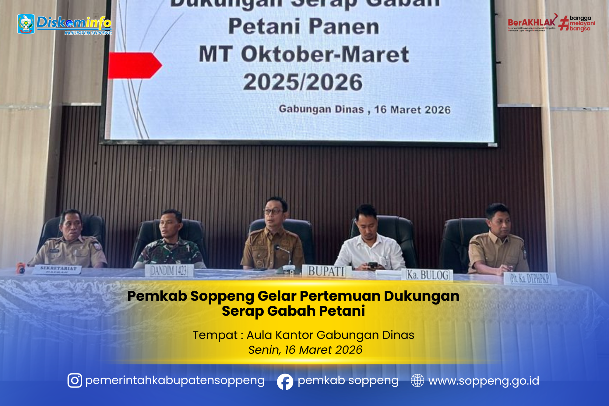 SOPPENG, Warta72.com — Pemerintah Kabupaten Soppeng menggelar pertemuan koordinasi dukungan Serap Gabah Petani (SERGAP) untuk masa panen Oktober 2025 hingga Maret 2026. Kegiatan berlangsung di Aula Kantor Gabungan Dinas Kabupaten Soppeng, Senin (16/3/2026).